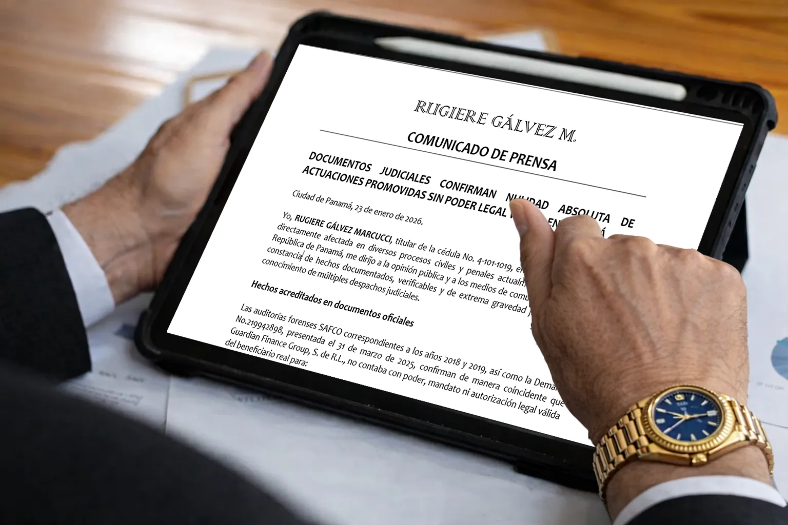 Yo, RUGIERE GÁLVEZ MARCUCCI, titular de la cédula No. 4-101-1019, en mi condición de parte directamente afectada en diversos procesos civiles y penales actualmente en curso en la República de Panamá, me dirijo a la opinión pública y a los medios de comunicación para dejar constancia de hechos documentados, verificables y de extrema gravedad jurídica, hoy bajo conocimiento de múltiples despachos judiciales.